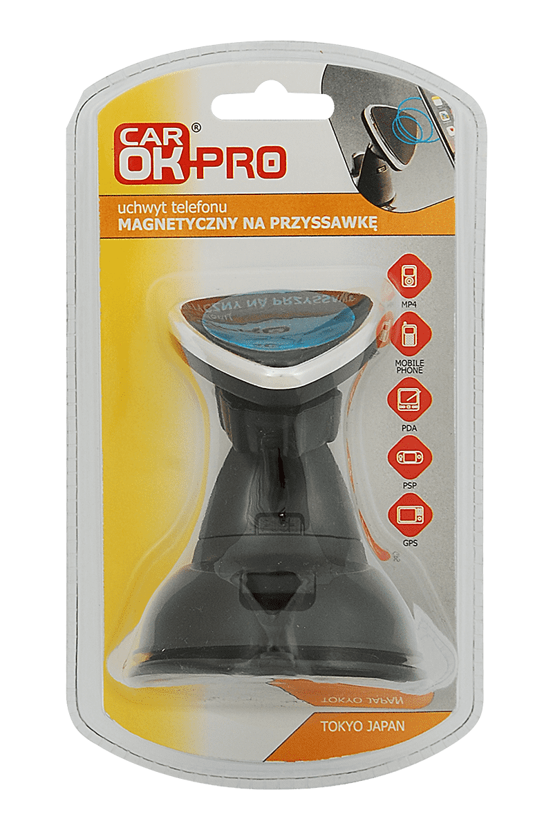 Uchwyt telefonu MAGNETYCZNY – PRZYSSAWKA CAR OK Media Pro jest nowoczesnym uchwytem do urządzeń mobilnych. Silny magnes umieszczony na przegubie oraz załączona płytka ferromagnetyczna zapewnia utrzymanie dowolnego urządzenia o wadze do 250 g. Specjalna żelowa przyssawka o zwiększonej przyczepności trwale i stabilnie mocuje uchwyt do szyb lub płaskich powierzchni kokpitu. Obrotowy przegub kulowy umożliwia regulację zacisku uchwytu w zakresie 360°.
